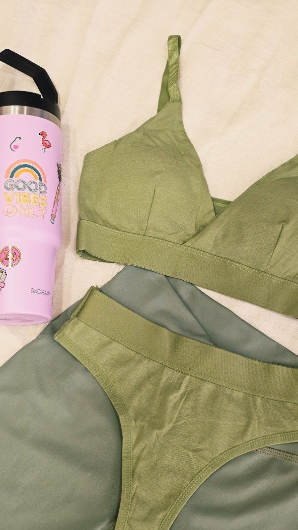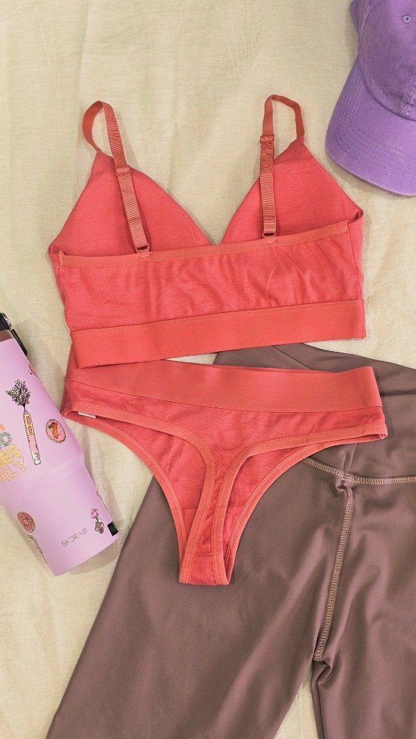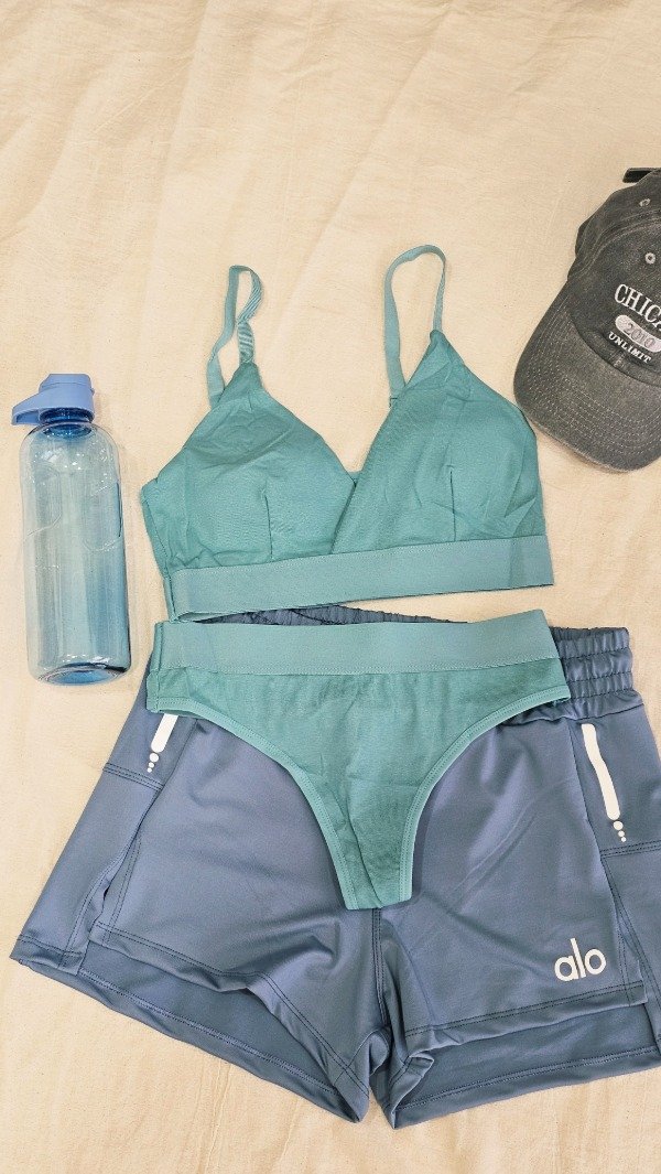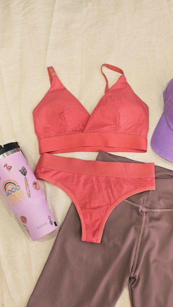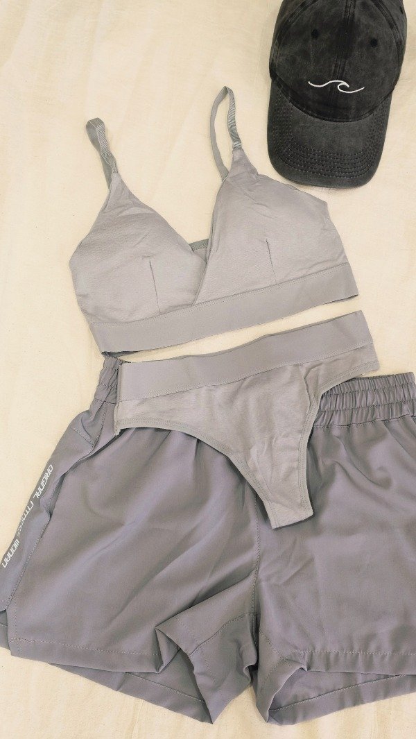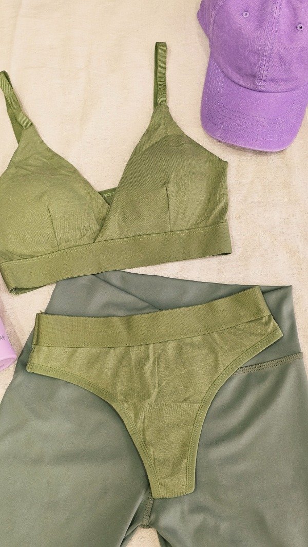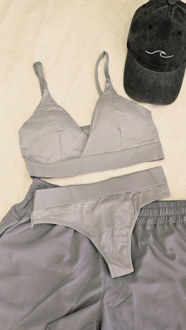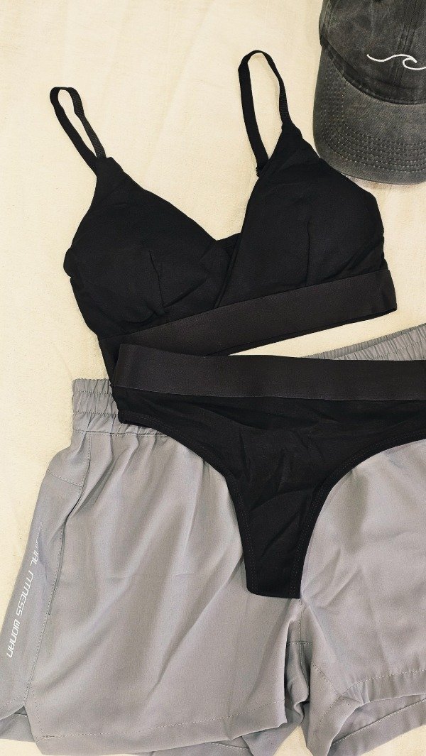 Set estilo deportivo. Corpiño triangulo cruzado forrado con almohadillas. Espalda entera y bretel regulable